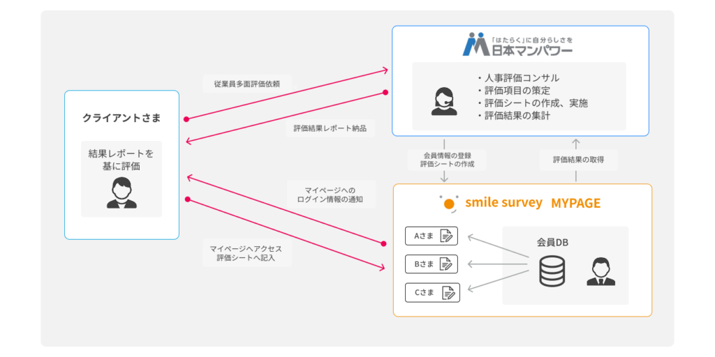キャリア開発支援の専門機関として、企業向け研修や人材育成支援など幅広いサービスを提供されている株式会社日本マンパワーさま。セキュリティ基準の高度化や運用コストの見直しをきっかけにスマイルサーベイを導入いただき、設問設定や回答者管理を自社で行えるようになったことで、これまで外部へ依頼していた運用の効率化につながりました。現在は研修やコンサルティングと連動した多面評価で活用されており、今後はキャリア自律サーベイなど、さらなる活用拡大も検討されています。また、新たな機能への期待も寄せられており、今後のさらなる活用の広がりにも注目が集まります。須田さま、中溝さま、この度はご協力いただき誠にありがとうございました。