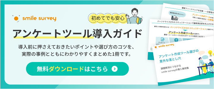 ➡ アンケートツールに関心を持っていただいた方は、ぜひsmile surveyのホワイトペーパーもあわせてご覧ください。導入事例やサービスの強みをわかりやすくまとめていますので、業務の参考としてご活用いただけます。